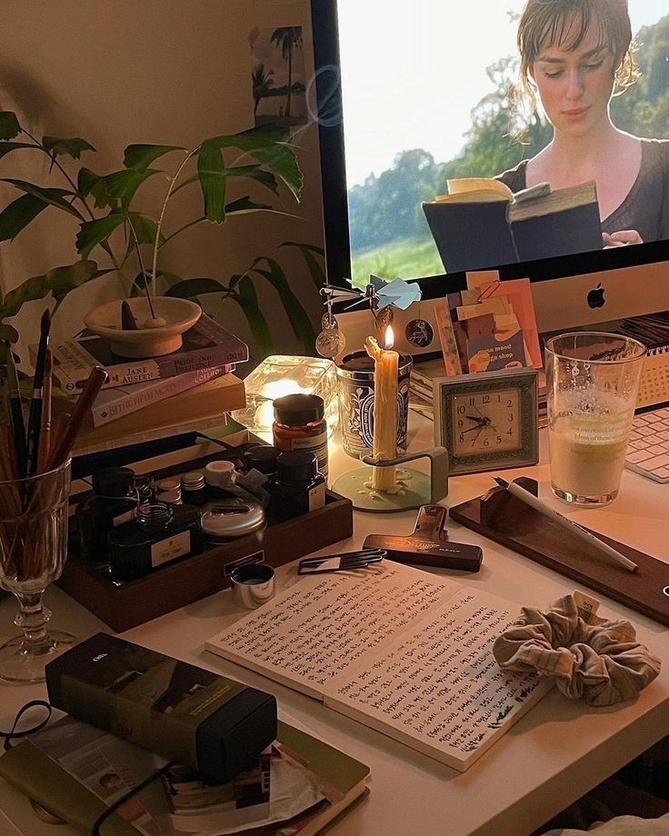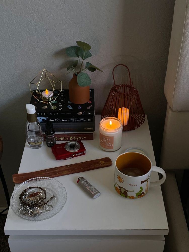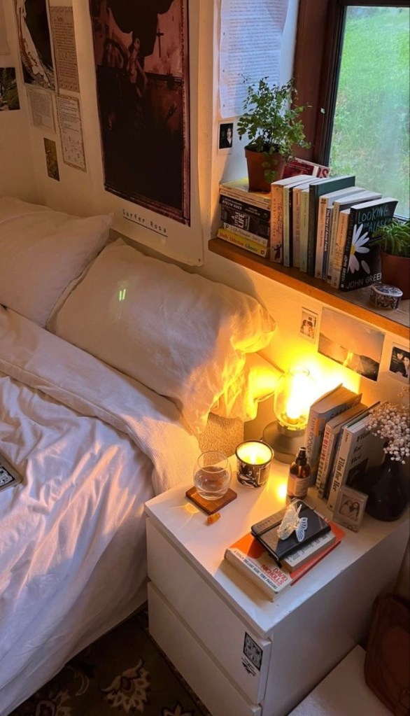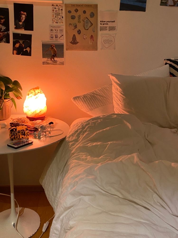 The 2 other important aspects I think a uni room must have is lighting and greenery. Including plants of different types whether that be real or fake, potted of hanging, adds a refreshing tone to your bedroom by connecting it with nature. It is also a nice touch to have multiple forms of lighting like fairy lights, salt lamps, sunset projectors. This is something I love about my uni room as it makes it feel cosy during the night when you don’t want to use the harsh over head lights.