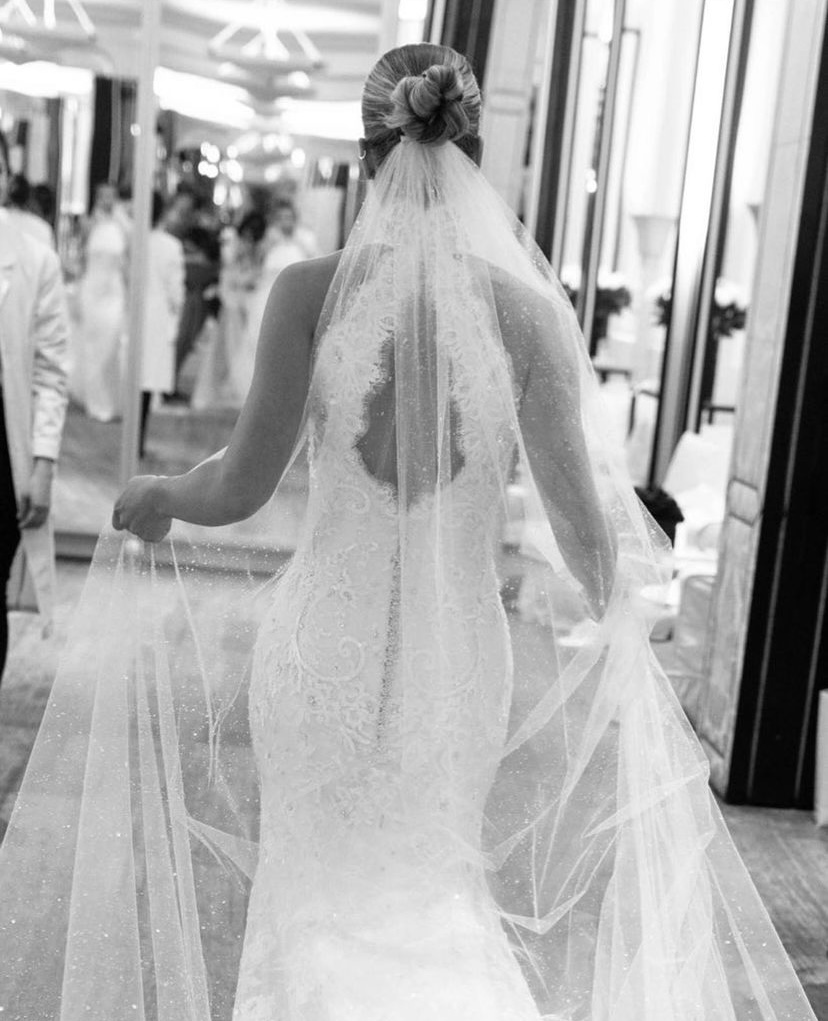 Her dress had an S&E embroidered in blue over her heart on the inside of the gown which such a meaningful touch. In addition to this personal element, there was also a heart design in lace in the middle of her chest and another one below mirroring it. The elegant line of this dress was not what she originally imagined for her wedding however, as she got older she realised she “wanted something a bit more simple”. The so-called simplicity of this dress is why everyone is so obsessed with it, the long train and veil add femininity to her vision that can only be described as sophisticated.