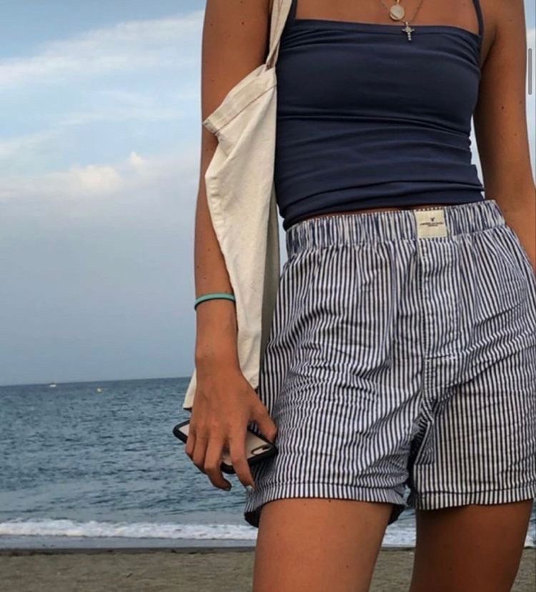 There is a recurrent theme of stripes throughout this aesthetic, and the first aspect I would like to highlight is the striped bottoms. Below, you can see a selection of shorts, linen trousers, and cargo trousers, all featuring a similar blue and white striped print. This element adds a touch of the nautical side of the aesthetic and creates a clean and polished look overall.