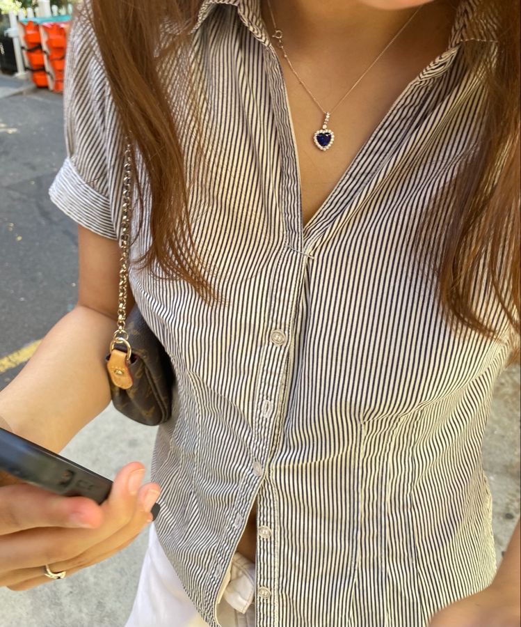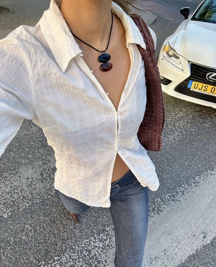 For a capsule wardrobe, it is important to have a simple button-up shirt at your disposal. This versatile piece can be utilised for layering or worn on its own, depending on the weather, making it perfect for transitioning from summer to winter. I particularly appreciate the styling choice of leaving a few buttons at the top and bottom of the shirt undone, while buttoning up the middle. This creates a casual look that is perfect for everyday wear, adding a touch of youthfulness and making the outfit less conservative.