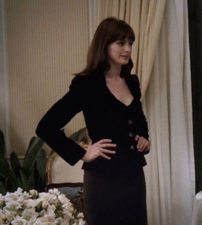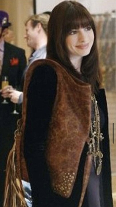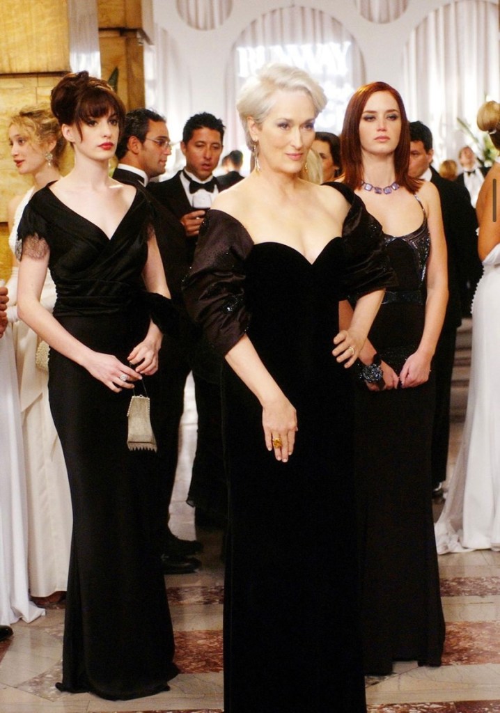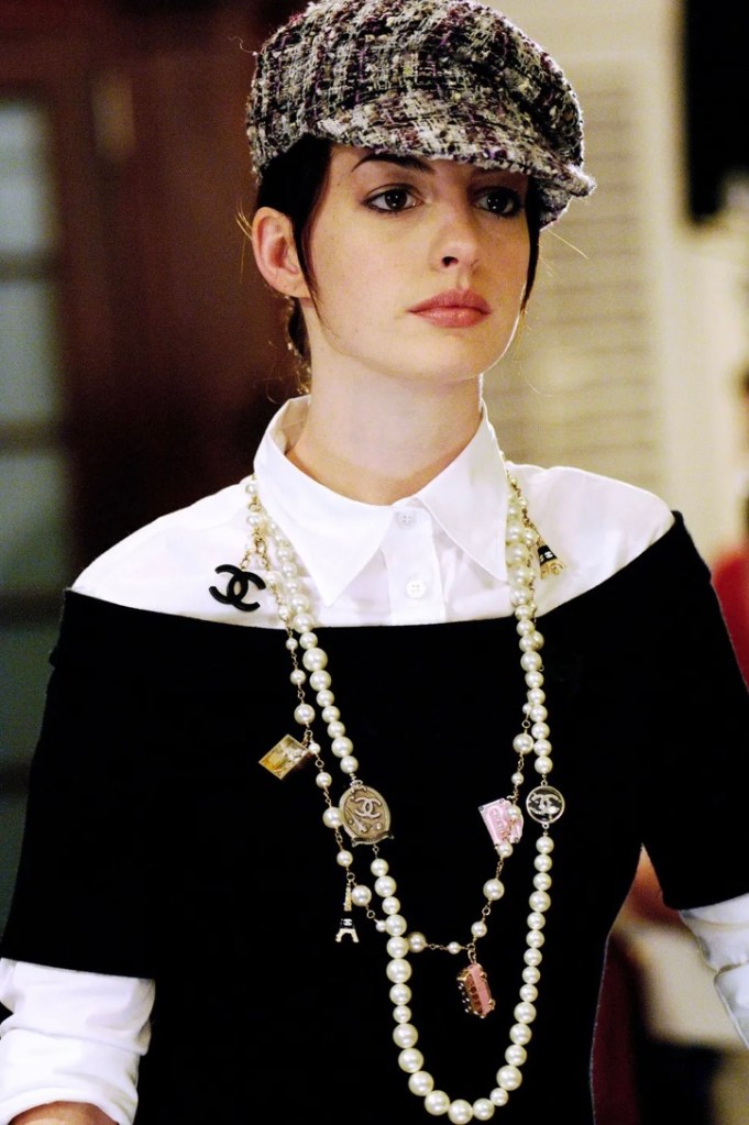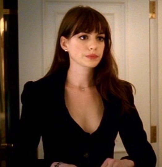 The final look that I have chosen for this blog post is an incredible outfit worn by Anne Hathaway. There is a stunning contrast between the strength of the exaggerated shoulder pads and the femininity of the plunging neckline. This harmonious combination creates an almost regal look, further accentuated by the dark eye makeup. Andy complements this outfit with minimal jewellery, aiming to draw full attention to the clothing itself. This showcases her range in stylistic decisions and highlights her ability to let the garments speak for themselves. It’s a powerful and striking ensemble that demonstrates the versatility and impeccable fashion sense of her character.