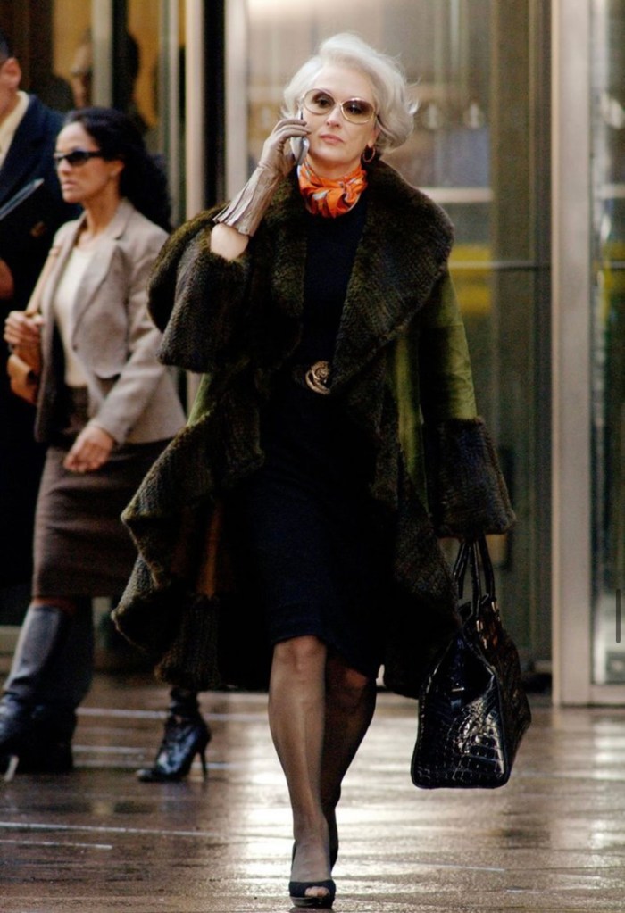 This Miranda Priestly outfit, featuring an extravagant coat, is a must-have inclusion due to its embodiment of old money and sophistication, two elements that many aspire to emulate in today’s world. I also adore the contrasting pop of colour provided by the orange neckerchief. While a neckerchief may not be everyone’s favourite choice of accessory, you can easily achieve a similar look by opting for a scarf or necklace instead