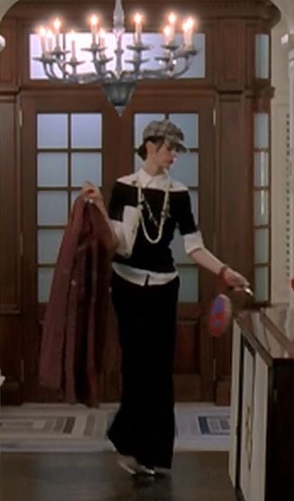 This outfit is undeniably my favorite from the movie, as it beautifully showcases the development in her style. The attention to detail in this look is remarkable, from the intricate collar and cuffs that elevate the outfit to the simplicity of the preppy pleated skirt. Once again, we witness the inclusion of long necklaces, and in this case, the addition of pearls communicates elegance and sophistication. Furthermore, the choice of shoes is stunning, with the thin strap in front adding a touch of complete elegance, similar to that of the sheer tights